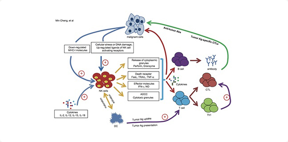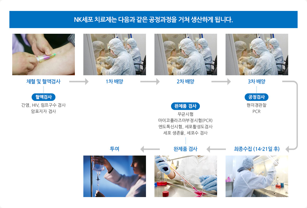 SMT BIO의 세포치료제는 자연살해세포 (Nkcell)를 이용한 치료제로써, NK세포는 세포살해활성을 가진 선천림프구세포로 항원특이적인 수용체를 가진 T세포, B세포와 달리 다양한 선천면역 수용체를 세포표면에 발현하며 이를 통하여 암세포에 대한 선택적인 인지가 가능하고 암세포를 인지하면 다른 활성화과정 없이 즉각적으로 암세포를 제거할 수 있는 cytotoxicity를 보이는 세포입니다.